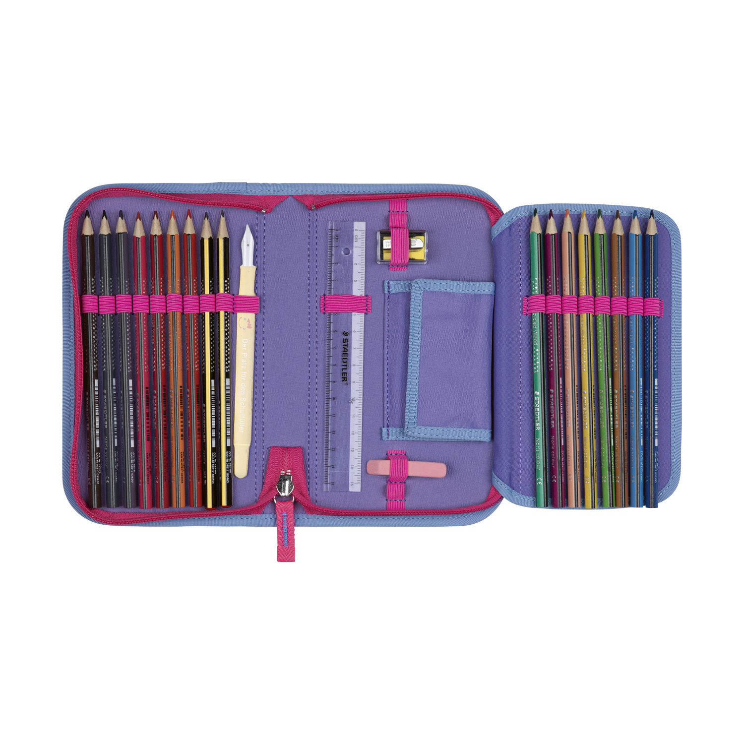 Gefülltes Schüleretui: Bestückt mit hochwertigen Staedtler-Buntstiften und weiteren Schreibutensilien.