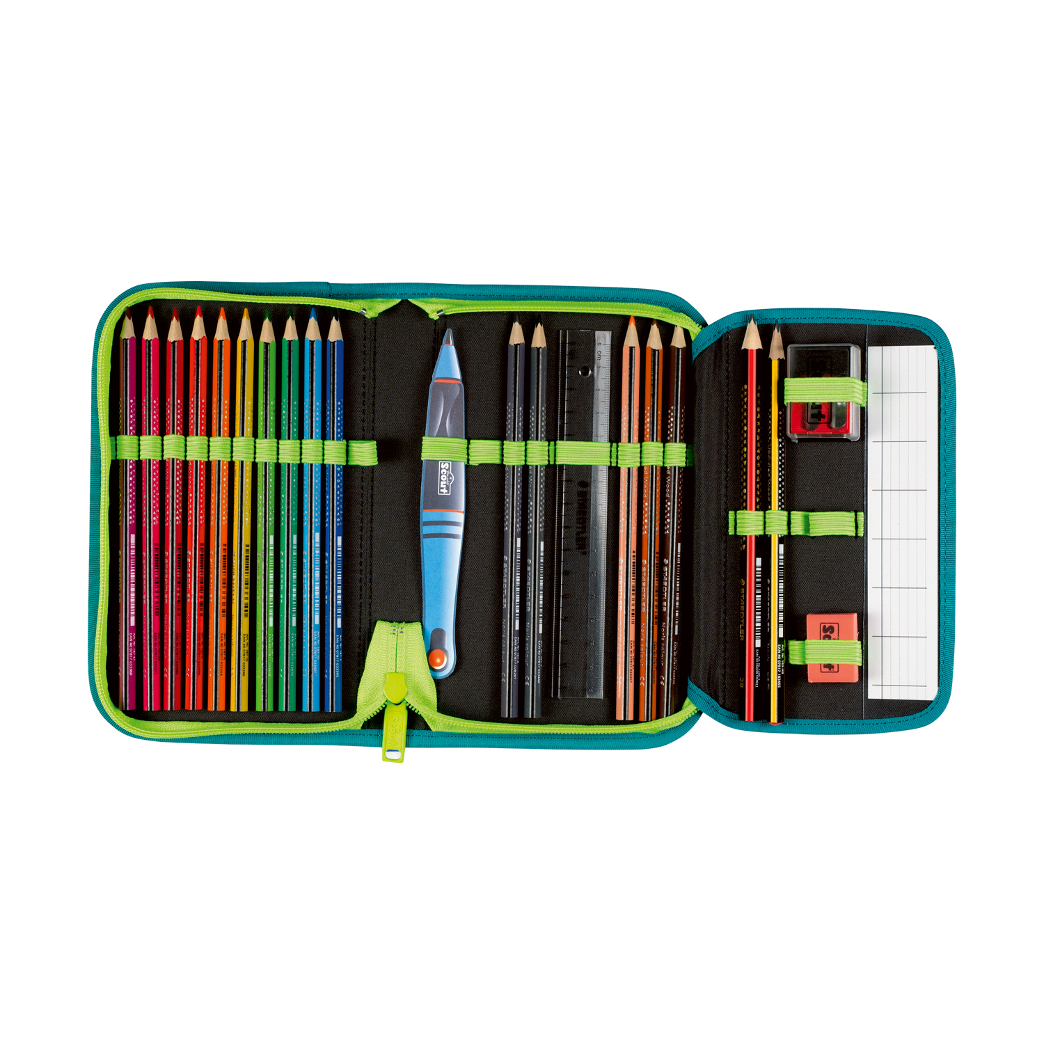 Federmäppchen: Gefüllt mit Staedtler Qualitätsbuntstiften und weiterem Schreibzubehör.